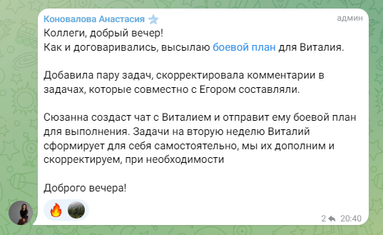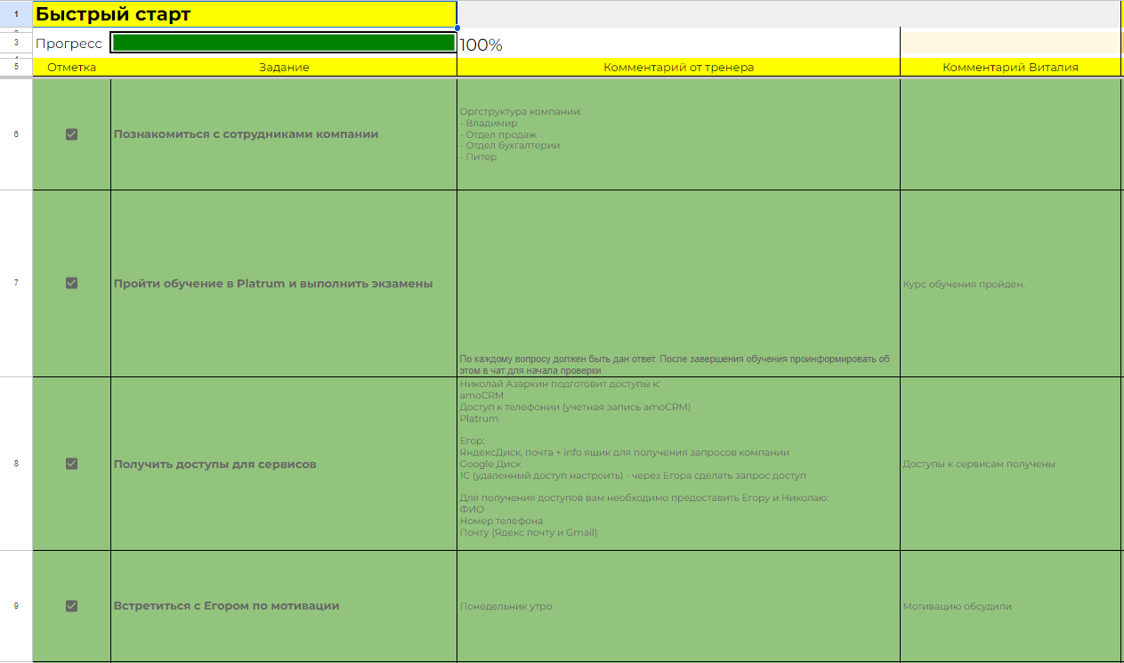 Выдали "Боевой план" на первые две рабочие недели для последовательного понимания выстроенного процесса продаж