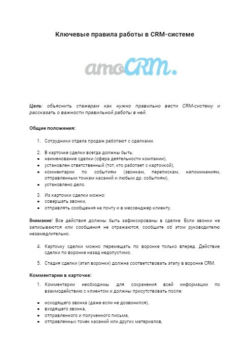 Содержит ключевые принципы и правила работы в CRM-системе. Рассказываем о движении сделки во воронке продаж, а также о карточке сделки. Здесь также содержится информация о том, как менеджеру работать с задачами.