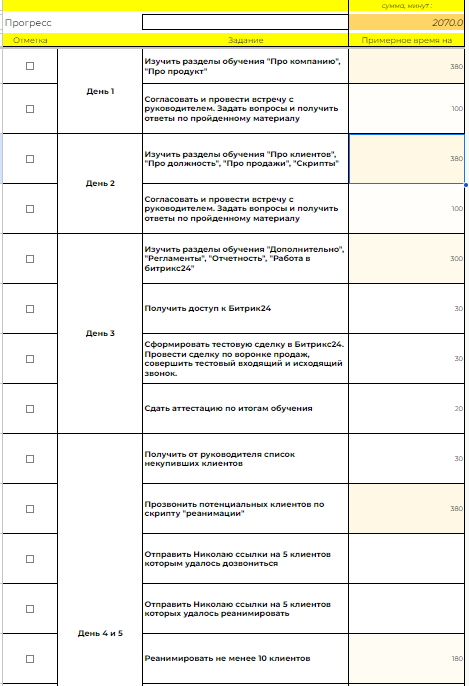 Выдали "Боевой план" на первые две рабочие недели, необходимый для получения первых продаж