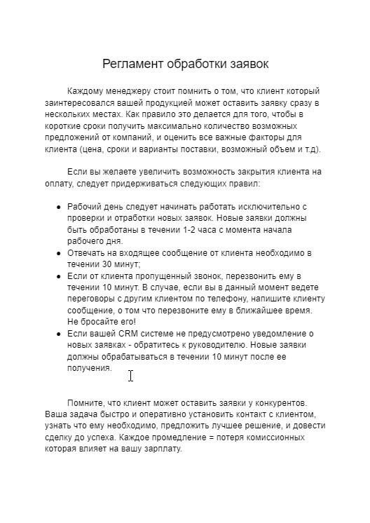 - регламент работы обработки входящей заявки; - что делать в случае крупного опта; - регламент выставления счета; - регламент на этапе формирования договора с клиентом; - регламент как выходить на ЛПР; - регламент общения по переписке + приемы для увеличения продаж по переписке; - пошаговая инструкция по товарному кредитованию.