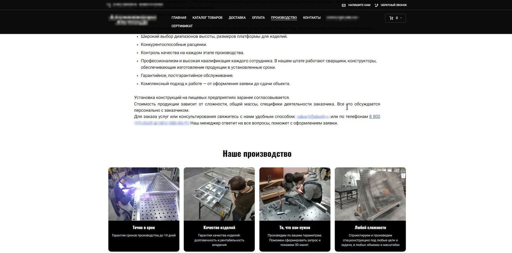 Прописали УТП, исправили тех ошибки, подключили web аналитику, добавили визуализацию процесса производства. Сформировали валидный товарный фид и выгрузили для Яндекс Webmaster и 2ГИС. Подключили формы захвата, сделали кликабельными номера телефонов. Настроили проброс заявок в CRM.