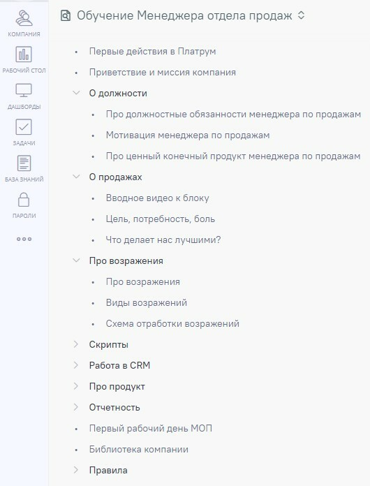 Сформирован обучающий блок для МОП в сервисе автоматизации менеджмента Platrum, содержащий около 40 документов: обучающие файлы+ видео, скрипты для разных сегментов клиентов, разного рода шаблоны, внутренние и обучающие регламенты и т.п.