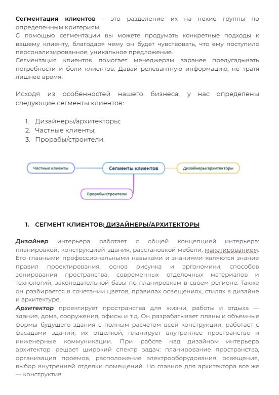Прописан каждый аспект клиентского сервиса компании для каждого сегмента клиентов и преимущества обслуживания клиентов в сравнении с конкурентами.